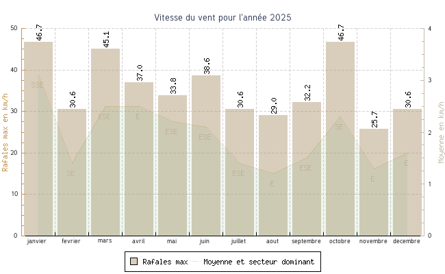 | octobre | 2.2 °C | 5.6 °C | 16.7 °C | 12.5 °C | 8.7 °C | 2.3 km/h | 46.7 km/h | SE |