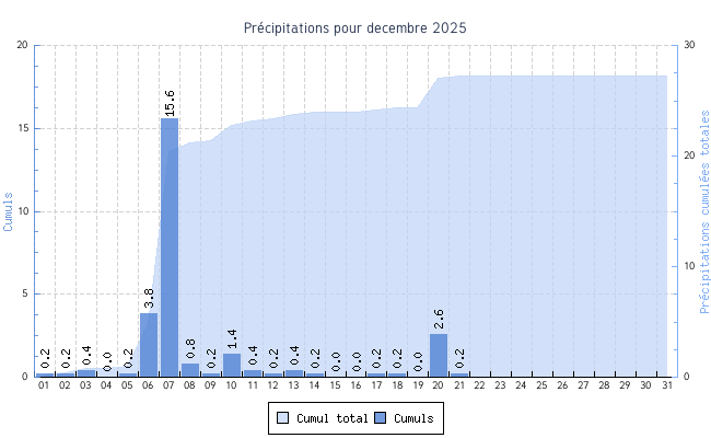 | Total | -2.2 °C | 13.7 °C | 5.5 °C | 1.6 km/h (30.6 km/h) | E |