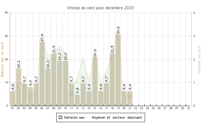 | min | max | moy | Vitesse (rafales) | Secteur | ||